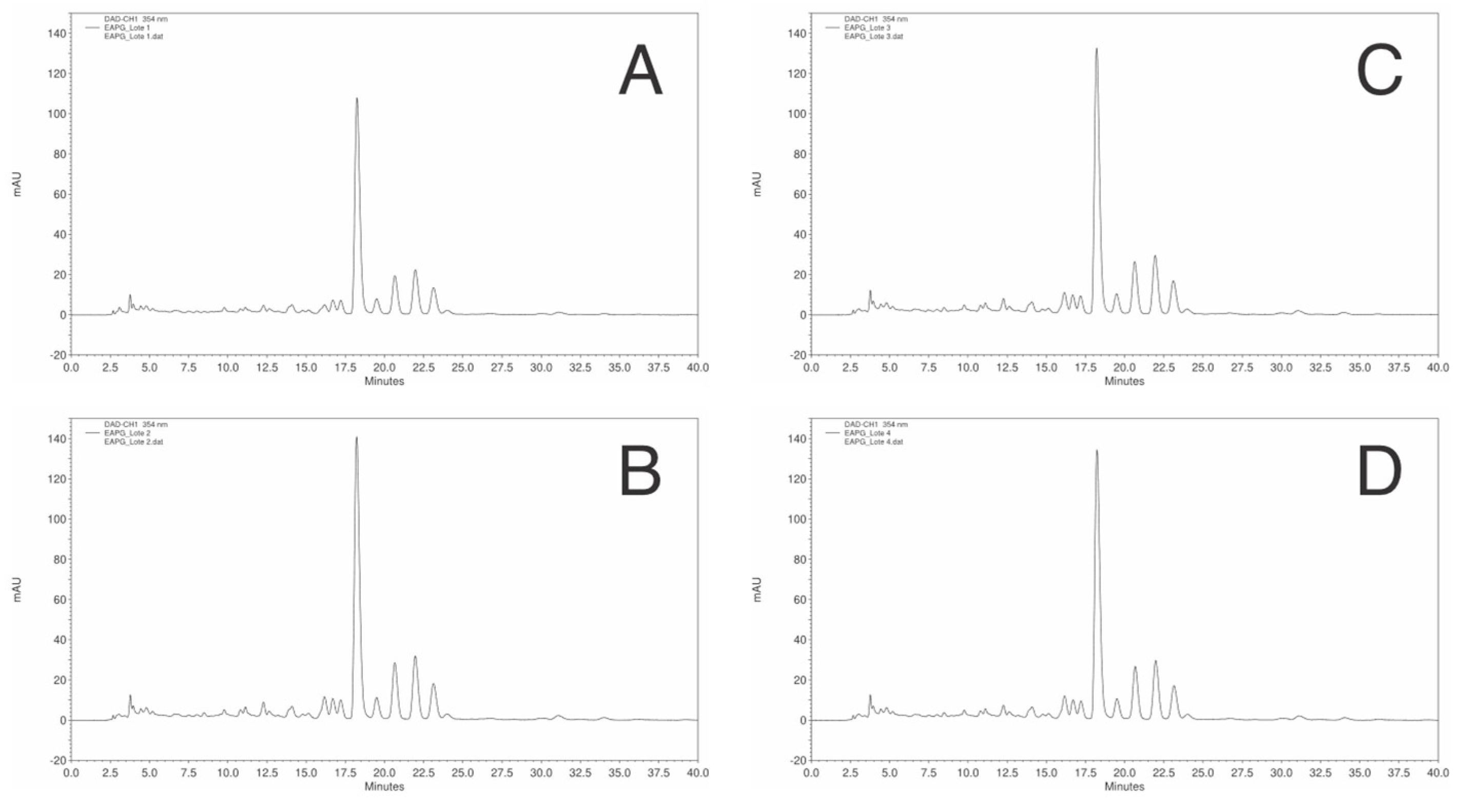 Figure 1, all four evaluated batches yielded nearly identical chromatographic profiles, demonstrating consistent phytochemical composition across the samples. To verify the presence of key compounds previously reported in