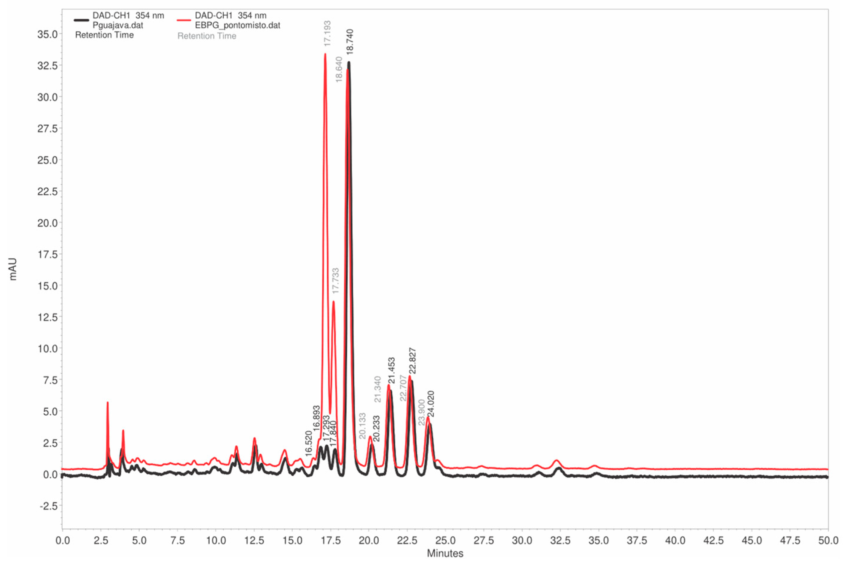 Figure 4), an additional HPLC-DAD study was performed using EAPG samples individually enriched with isoquercitrin, hyperoside, and guaijaverin standards (