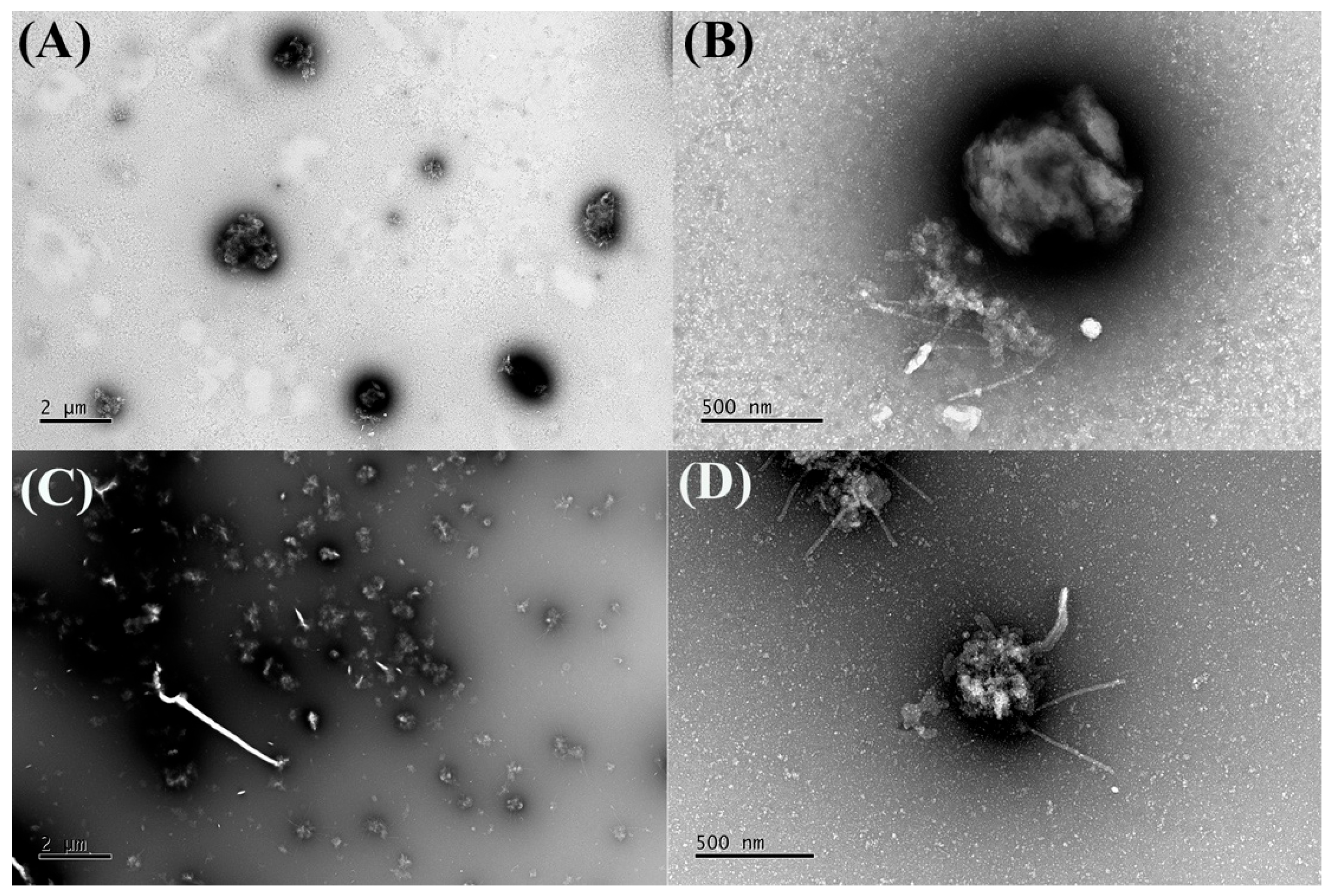 Finally, the morphology of the chitosan nanoparticles, entrapping or not EAPG, was assessed by transmission electron microscopy (TEM). The samples were previously diluted 1:100 (v/v) in purified water, placed on Formvar-coated copper grids, and dried at room temperature. For contrast enhancement, the grids were stained with 20 µL of a 3% uranyl acetate solution and air-dried for 10 min. The samples were then examined under a transmission electron microscope JEM-1011 (JEOL, Tokyo, Japan) at magnifications of 5000× and 20,000×.