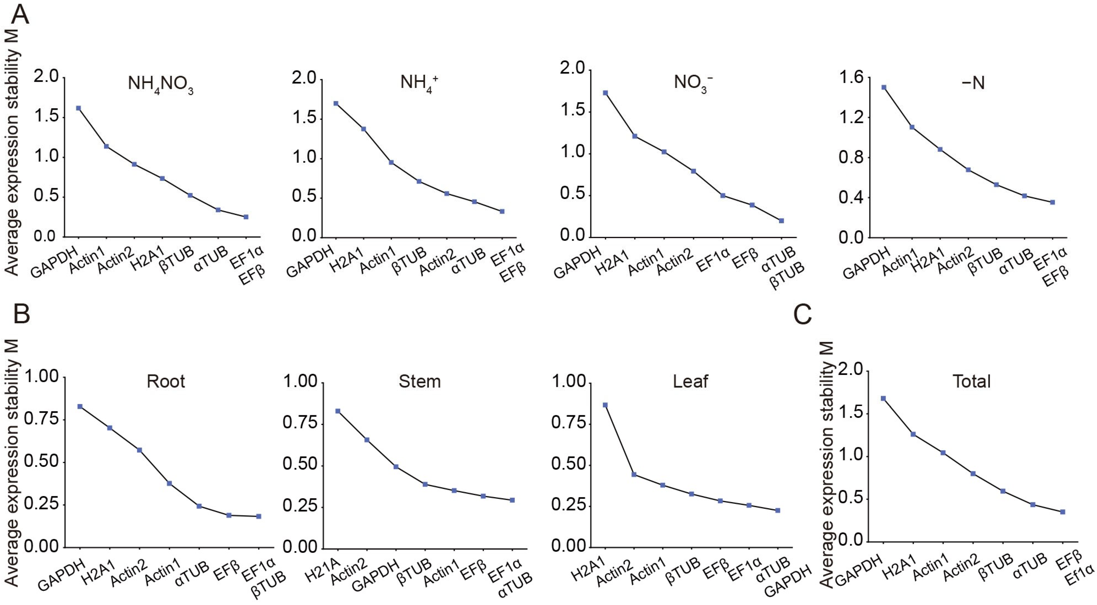 Tissues | Root | (EF1α/βTUB) 0.18 | (EFβ) 0.19 | (αTUB) 0.24 | (ACT1) 0.38 | (ACT2) 0.57 | (H2A1) 0.70 | (GAPDH) 0.83 | |