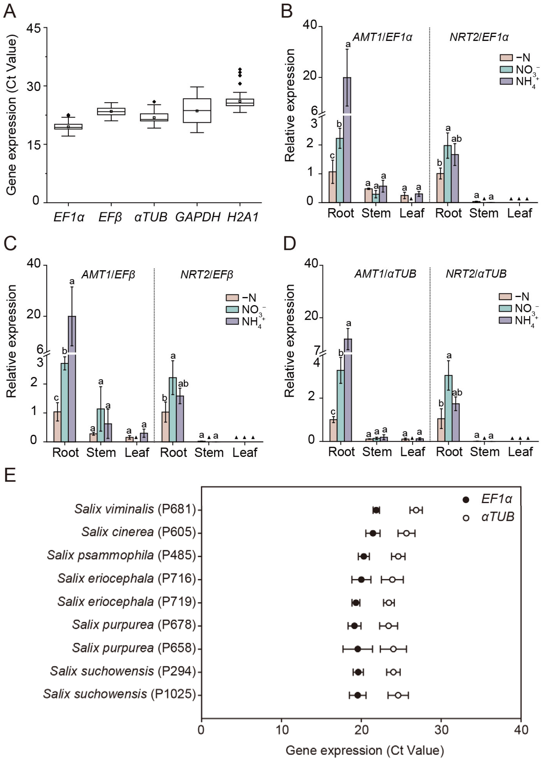 Huang, L.; Zhang, Y.; Gao, F.; Fu, Y.; Sun, J.; Zhou, J.; Tao, J.; He, X.; Guo, N. EF1α and αTUB Are Stable Reference Gene Pairs for RT-qPCR-Based Gene Expression Studies in Salix suchowensis Under Nitrogen Treatment Conditions. Plants 2025, 14, 3101. https://doi.org/10.3390/plants14193101