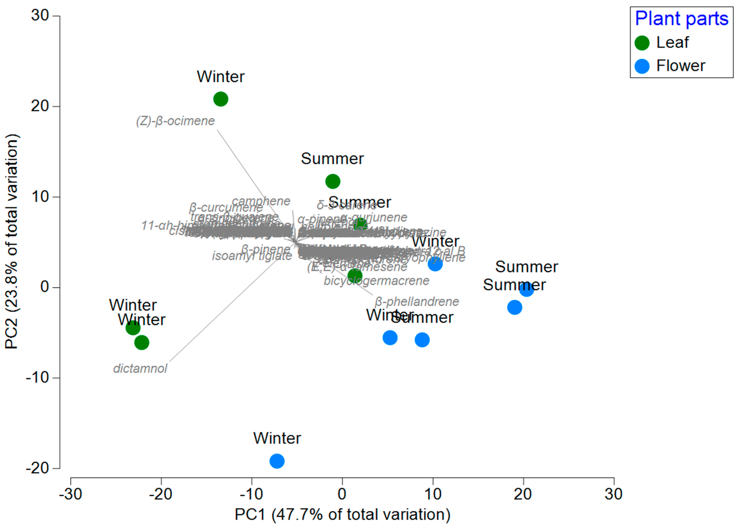 Calva, J.; Suquilanda, D.; Benítez, Á.; Armijos, C.; Ramírez, J. Seasonal Influence on Volatile Organic Compounds from Flowers and Leaves of Lepechinia mutica Extracted by SPME-GC-MS. Plants 2025, 14, 3103. https://doi.org/10.3390/plants14193103
