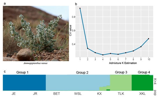 - Li, A.; Ma, M.; Li, H.; He, S.; Wang, S. Genetic diversity and population differentiation of a Chinese endangered plant Ammopiptanthus nanus (M. Pop.) Cheng f. Genes 2023, 14, 1020. [Google Scholar] [CrossRef]