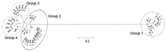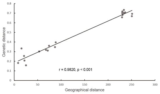- Excoffier, L.; Smouse, P.E.; Quattro, J.M. Analysis of molecular variance inferred from metric distances among DNA haplotypes: Application to human mitochondrial DNA restriction data. Genetics 1992, 131, 479–491. [Google Scholar] [CrossRef]