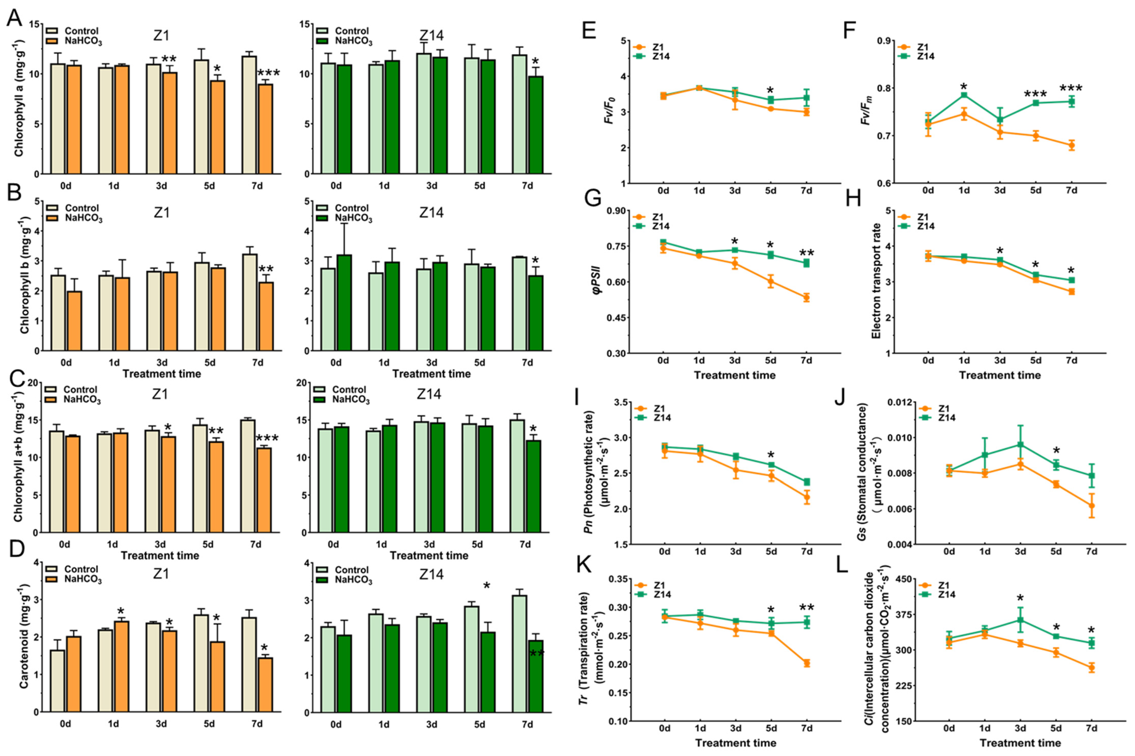 2.2. Effects of Chlorophyll, Carotenoids, and Photosynthetic Fluorescence Parameters of Sorghum Seedlings Under Alkali Stress