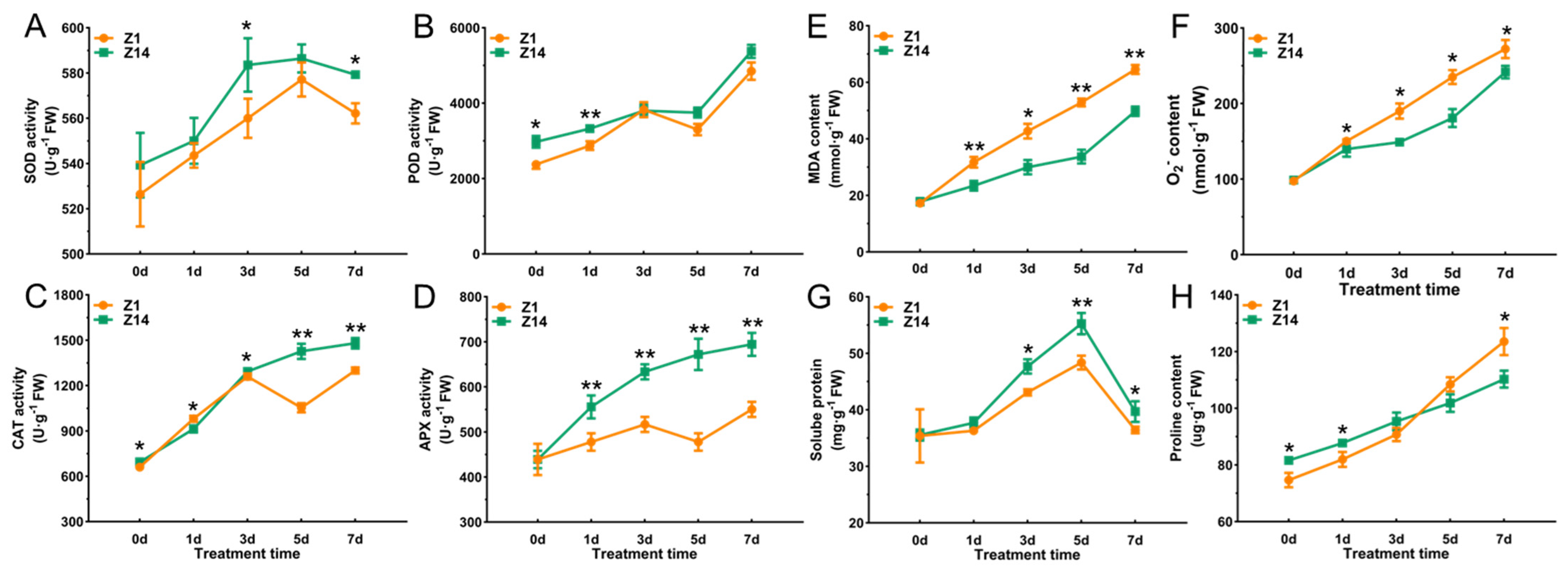 2.3. Response of the Antioxidant System of Sorghum Seedling Leaves Under Alkali Stress