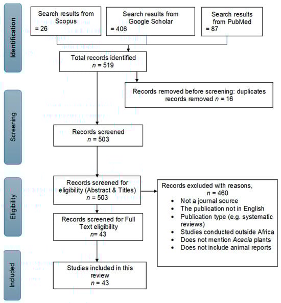 The literature on the genus Acacia in African livestock disease management was compiled from three databases including Scopus, PubMed and Google Scholar. The systematic review search was conducted in January 2025 and includes research articles published from 2001 to 2024, reflecting over two decades of relevant scientific literature. The search was conducted using the following keywords: ethnoveterinary OR ethnomedicinal AND biological activity AND phytochemistry OR chemical compounds AND livestock diseases AND Acacia OR Vachellia AND toxicology AND Africa. Boolean operators and exact search strings were used, such as the following examples: (“Acacia” OR “Vachellia” OR “Senegallia”) AND (“ethnoveterinary” Or “ethnomedicinal”) AND (“livestock” OR “animal health”) AND (“toxicology” OR “pharmacology” OR “biological activity”). In total, the initial search yielded 519 articles from the three databases. After a screening and eligibility check, 43 research articles met the inclusion and exclusion criteria and were included in the review (Figure 1). Articles were initially screened based on English language, title and abstract. The full-length papers were obtained and evaluated if abstracts of the papers met the inclusion criteria. All keywords were searched electronically, while the titles and abstracts were screened manually. This review was conducted in accordance with the PRISMA 2020 guidelines for reporting systematic reviews. No protocol was registered for this review.