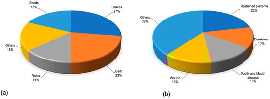 Distribution of (a) plant parts used in ethnoveterinary practices and (b) livestock ailments treated with Acacia/Vachellia/Senegalia species.