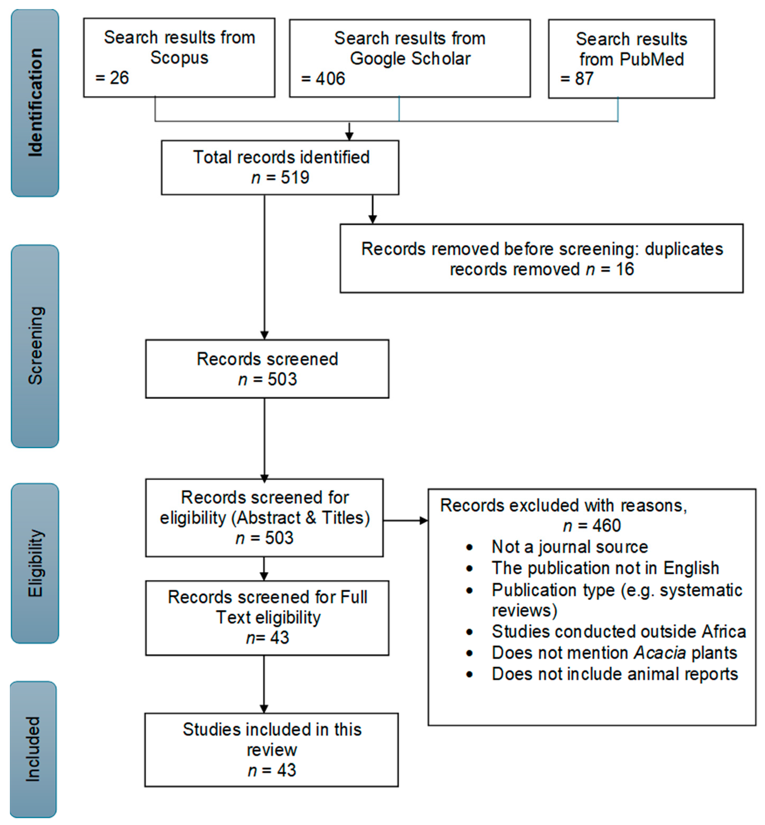 - Veronica, S.A.; Cheruiyot, K.S.; Bosibori, M.J.; Munene, I.M.; Murugi, J.; Piero, N.M. Antiinflammatory, analgesic and antipyretic effects of dichloromethane stem bark extract of Acacia mellifera. J. Phytopharmacol. 2017, 6, 239–246. [Google Scholar] [CrossRef]