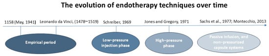 First attempts to apply endotherapy on trees were made by exploring methods of trunk injections, delivering chemicals using injecting solutions into a hole made in the tree stem. The injecting mechanism evolved over time through evaluating different solutions of hole creation, methods of injectate delivery, and pressure sources used to supply the injected material, resulting in four phases of development: the empirical period, low-pressure injection stage, high-pressure injection phase, phase of advancements with passive infusion, and non-pressurized capsule systems (Figure 1). Each improvement offered different benefits and limitations in terms of distribution speed, invasiveness, and scalability [6,10].