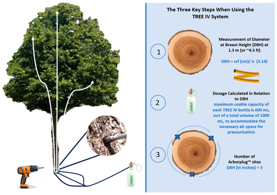 Tree endotherapy, also known as trunk injection, is a technique used for injecting substances directly into tree trunks [1,2]. This method allows for the systemic delivery of compounds such as insecticides [3], fungicides [4], and antibiotics [5] directly into the plant’s vascular system by exploiting xylem transport [6]. Most studies involving endotherapy concerned the application of chemicals for the control of pests and pathogens; however, several recent studies have shown the possibility of applying other product classes (e.g., phytohormones and bioformulations) in order to enhance plant growth and abiotic stress tolerance and induce defense response resistance against pathogenic infections [7] (see Section 5.1). Chemicals have also been used to try to kill trees in order to limit the epidemic spread of diseases. Panconesi [8] attempted to inject sodium hypochlorite and the herbicide glyphosate (alone or in combination) under pressure into the trunks of plane trees growing in rows infected with the pathogen Ceratocystis fimbriata f. sp. platani, the causal agent of “blue stain canker”, to prevent its spread through root anastomoses between neighboring trees. Solutions like this are nothing new: as early as the 15th century, Leonardo da Vinci [9] attempted to poison apple trees by injecting arsenic into their trunks using a rudimentary drill.