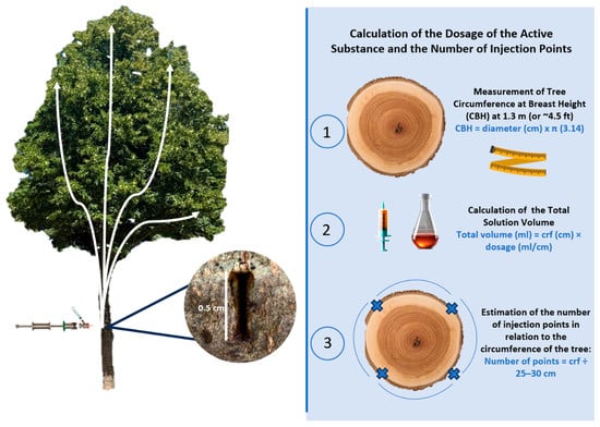 Endotherapy presents a compelling alternative to traditional pesticide application methods by offering significant advantages in reducing environmental pollution, minimizing the risk to non-target organisms, and enhancing the safety of both applicators and the public [18]. For these reasons, it is gaining recognition as a promising alternative to conventional pesticide application methods like spraying and soil drenching in managing pests and diseases in various tree species, including those in orchards, forests, and urban areas [13]. As endotherapy involves the direct introduction of plant protection products into the tree’s vascular system [14], it offers significant advantages in terms of reducing environmental impact and enhancing safety for humans, animals, and the environment in general. Conventional pesticide application methods, particularly spraying, are often associated with substantial off-target losses due to drift [1], with estimations suggesting that a vast majority of applied pesticides (around 99.9% in some cases) may not reach the target pests and instead disperse into the environment [2]. Endotherapy directly addresses this issue by significantly reducing the dispersion of plant protection products into the environment [15,19]. By delivering the active ingredient directly into the sap circulation system, it minimizes or even zeroes out the drift and dispersal of chemicals, thus limiting the exposure of non-target organisms such as beneficial insects, birds, and wildlife [20]. This targeted approach contributes to the ecological resilience of ecosystems by avoiding broad environmental contamination [21]. Furthermore, endotherapy enables the use of lower doses of plant protection products compared to spraying or soil drenching to achieve equivalent or even higher efficacy [2,12]. Because the entire dose is delivered directly into the sap flux, a greater quantity of the product reaches the target site within the tree [11]. This reduced reliance on large quantities of pesticides further lessens the overall environmental burden associated with plant protection [6]. Another critical environmental benefit of endotherapy is that it avoids the contamination of surface and groundwater [22]. Unlike soil drenching, which can lead to leachate and accumulated residues that pollute groundwater [10], or spraying, where runoff can contaminate surface waters, the closed system of trunk injection prevents the release of pesticides into these sensitive water bodies [15]. This is particularly important in urban areas where chemical spraying might be prohibited or restricted due to the proximity to water sources and human populations [14]. Endotherapy also offers enhanced safety for both the operators applying the treatments and the general public. When spraying methods are employed, workers are at a higher risk of exposure to high concentrations of agrochemicals during mixing and application [13]. Endotherapy significantly reduces the exposure of operators to plant protection products as it eliminates the need for the widespread handling and spraying of chemical substances [7]. The products are directly injected into the tree, minimizing the risk of dermal contact or inhalation by the applicator. Moreover, endotherapy reduces the risk of public exposure to pesticide residues [3]. Since the plant protection products are contained within the tree’s vascular system, the potential for residues to drift onto unintended surfaces or remain on the exterior of the plant is substantially lower compared to spraying [17]. Studies on fruit trees treated with trunk injections have shown that while the active ingredients can be found in the fruits, the residue levels at harvest are often below the Maximum Residue Levels (MRLs) defined by authorities [13]. For example, in apple trees, residues have been reported to persist at levels significantly below the MRL of 3 ppm established by the US EPA [23]. In cherry trees, injecting 0.56 g of acetamiprid into the trunk provided more than 95% control of Rhagoletis cerasi while keeping residues below permitted levels [24]. Acetamiprid and sulfoxaflor were detected at maximum concentrations of 0.047 mg/kg and 0.006 mg/kg, respectively, in pine nuts. These values remained below the MRLs set by Korea, the EU, and the US, and short- and long-term risk assessments indicated negligible risk to consumer health [25]. These accurate checks on tolerable residue thresholds ensure a greater level of safety for consumers.