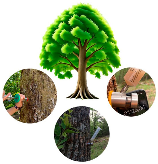 Modern endotherapy, also taking advantage of the increased knowledge of plant physiology principles underlying the absorption and translocation of the active ingredient in the tree, has evolved with advancements in injection devices, shifting from simple hand drills to pressurized systems and lenticular blades designed to minimize tissue damage [10] (see Section 4). At present, endotherapy is considered an environmentally friendly technique within the new farming management concept of “precision agriculture”, which aims to increase efficiency, productivity, and sustainability in agriculture, thus also taking care to maintain ecosystem health and mitigate climate change impacts (see Section 3). In plant protection, the technique has been predominantly employed in the treatment of pathogens and pests affecting perennial crops, such as fruit trees, the type of crop on which the greatest number of studies have been conducted [11]. However, many studies have investigated the possibility of applying endotherapy to protect deciduous and ornamental trees from damaging agents, including invasive organisms [11,12] (see Section 5.3). The increasing adoption of endotherapy, particularly in the management of urban and rural trees, underscores its importance as a promising innovation, offering a potentially vital and ever-evolving approach to tree care, aided also by recent technological advances (see Section 5.2). However, significant challenges remain, including the risk of tissue damage at the injection site, the need for specific protocols for vulnerable tree species, and knowledge gaps regarding aspects like optimal dosages and long-term ecotoxicological effects (see Section 6). The purpose of this review is to provide an overview of endotherapy techniques and how they have evolved as a result of scientific advances, such as those relating to increased knowledge of the structure of the xylem network underlying sap flow dynamics. It will also highlight recent innovations in the precise physical administration of active ingredients and in formulation technologies. Improvements in endotherapy technology will require continued investment in research, the standardization of methodologies, and strong collaboration between scientists, industry, and tree care professionals (see Section 7).