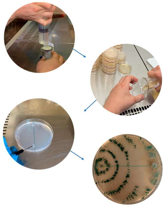 The selection of the active ingredient class and its specific formulation is paramount for effective endotherapy application, requiring systemic properties and suitability for injection, as classical agrochemical formulations may be inappropriate or even detrimental [2,47]. A wide range of active ingredient classes can be delivered via endotherapy, including insecticides, fungicides, antibiotics, nutrients, fertilizers, growth regulators, biostimulants, biopesticides, and defense activators [13]. Among the most commonly used insecticides are emamectin benzoate, imidacloprid, thiamethoxam, and abamectin, which have proven effective against pests such as the red palm weevil (Rhynchophorus ferrugineus) and the pine tortoise scale (Toumeyella parvicornis) [6,12,15]. Fungicides and related compounds like phosphonate, cyproconazole, and Dentamet® (zinc and copper complexed with citric acid) are applied via endotherapy, with devices like BITE®, Arbocap® (Ital-Agro, Turin, Italy), Chemjet® Tree Injectors (Logical Result LLC, Interlochen, MI, USA), and various types of drill. These are used to manage several fungal, pseudofungal, and bacterial diseases, including those caused by Phytophthora species, certain grapevine wood pathogens (like Phaeomoniella chlamydospora), and Xylella fastidiosa [4,21,22,48,49,50,51]. Trunk injections of antibiotics, notably terramycin and penicillin G, using Chemjet® are used to combat bacterial diseases like fire blight (Erwinia amylovora) and lethal yellowing diseases in palms [5]. By offering a direct route for delivering these kinds of formulation into the tree’s vascular system, endotherapy fundamentally impacts both the distribution and persistence of these active ingredients compared to conventional applications. Bypassing external barriers like the cuticle and soil, endotherapy treatments can potentially lead to higher concentrations reaching internal targets [52]. Indeed, studies have shown that injected substances can be detected in canopy tissues like leaves and twigs, confirming their distribution [12,15]. Concerning persistence, some formulations specifically designed for endotherapy, such as the emamectin benzoate and Revive® products, are noted for their high persistence in several tree species (conifers, willows, ash, and palm), potentially lasting up to a year, significantly reducing the frequency of treatments required [10,13,14,15,53]. Oxytetracycline also appears to have increased stability and long-term efficacy when injected compared to foliar sprays, and its uptake and persistence has been demonstrated in Citrus spp., palms, and almond tissues [5]. However, while some products show long persistence, others, like endotherapy abamectin, may have a more limited duration, not always guaranteeing complete distribution of the injected substance throughout the entire plant and therefore potentially limiting the long-term efficacy of the treatment [53]. Persistence is largely governed by the conditions of the endotherapic method, which provides a physical barrier against environmental breakdown. For highly effective compounds like emamectin benzoate, this protection translates into measurable residue concentrations capable of providing disease or pest control for up to a year or longer, depending on the tree species and targeted pest [13,14,15]. For products like oxytetracycline, injection counters its inherent molecular instability, leading to long-term efficacy against vascular pathogens. In addition, establishing the optimal time of year for injection (e.g., spring versus fall) is important for predicting efficacy and compound residue, particularly in commercial production [5]. For these reasons, the need to research new formulations with improved bioavailability (translocation and persistence within the plant) is becoming important [12]. In addition, the extensive or improper use of chemically active ingredients, particularly antibiotics and pesticides, raises concerns about the development of resistance in target organisms [54] (see Section 6). The use of eco-friendly formulations is viewed as a promising strategy to address these issues. New product strategies are focusing on developing bioformulations to replace antibiotics and pesticides for endotherapy application [15,16,17,22]. The research has explored agents such as nanoparticle-based products, which could potentially be more potent and offer advantages like improved stability, systemic action, and slow release for longer-lasting effects [55,56,57]. Beyond formulation chemistry, the nature of the active ingredient itself is evolving towards more sustainable options. This includes the use of biocontrol agents (BCAs), such as fungi and bacteria, or natural products like plant extracts, essential oils, or antimicrobial peptides, applied via endotherapy [16,19,58,59,60]. Studies have evaluated the use of biocontrol strains like Trichoderma spp. for controlling pathogens in chestnut trees via endotherapy [19]. A crucial step before using BCAs in the field is their proper assessment for biocontrol potential. This can be performed in the laboratory using dual culture bioassays (Figure 5).