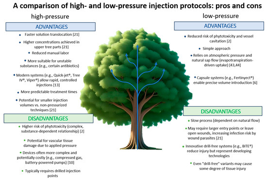Basically, endotherapy functions by applying products directly into the tree’s vascular system, specifically the xylem [1]. The injected substance is absorbed and distributed throughout the tree primarily by exploiting its normal absorption capacity, moving with the xylem sap flow that rises from the roots to the leaves, driven by the plant’s transpiration pull [20]. The physical act of creating an injection point in the trunk is supposed to induce a Venturi effect, where the temporary reduction in vessel cross-section causes sap speed to increase and pressure to decrease, facilitating passive absorption, especially when sap flow is high [44]. Low external pressure can also be applied to force uptake. For the treatment to be effective, the applied products, especially systemic ones, must be capable of translocating within the plant to reach the target location [6]. The efficiency and extent of this translocation and distribution are significantly influenced by the physicochemical properties of the active ingredients and the formulation itself, including factors like molecular mass, water solubility, lipophilicity (Kow), polarity (pKa), pH, viscosity, and stability [2]. Commercial formulations designed for conventional methods are often not compatible with vascular transfer, highlighting the need for specific formulations for endotherapy [45]. The process is also profoundly influenced by the plant’s own morphology and physiology, as xylem anatomy, seasonality, and formulation compatibility with vascular tissues significantly influence the plant’s ability to absorb and distribute active ingredients [6]. Key factors include the following: (1) the species characteristics, which necessitate adapting techniques and potentially equipment for different types of trees (e.g., palms vs. deciduous trees); (2) the trunk structure and vitality, as healthy trunks with good structure are better suited to these applications; (3) the tree’s age, as demonstrated by challenges in treating old or centenarian trees, possibly due to natural vessel occlusion hindering uptake; (4) and the presence of xylem vessel occlusion, which can be due to aging, cavitation, or disease [22]. Furthermore, the application technique itself, including factors like the presence or absence of drilling, the location, depth, angle, and diameter of the injection hole, and the needle shape, impacts uptake [13]. Damage caused by traditional drilling methods can negatively affect the functionality of adjacent woody tissues and delay wound closure, potentially impacting sap flow and product distribution [46]. Advanced injection systems aiming to minimize damage to woody tissues, particularly those employing drill-free techniques or lenticular-shaped blades, are often preferred to minimize damage to woody tissues and promote faster wound healing compared to traditional drilling methods [13]. Pressurized methods can offer faster translocation and predictability, while low/no-pressure methods may pose less risk of phytotoxicity or vessel cavitation [10]. The timing and method of administration are interdependent and depend on the specific active ingredient and the tree’s physiological stage, particularly sap flow and transpiration rates, to ensure the compound reaches the target area at the optimal concentration during the period of highest pest or pathogen pressure [46]. Ideally, injections should occur during periods of active sap flow and coincide with peak pest or pathogen vulnerability [1]. Hence, application during active transpiration is crucial to facilitate product movement within the xylem, correlating with the circulation of water and nutrients during the photosynthetic cycle. Additionally, adverse environmental conditions, such as drought or pre-existing vascular damage, may impair absorption and increase the risk of embolism or phytotoxicity. Hence, understanding these biological and physical interactions is fundamental for optimizing an endotherapy procedure.