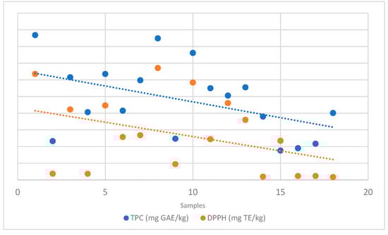 TPC was determined using the method described by Mustafa et al. (2016), with some modifications []. Briefly, 0.5 mL of the methanolic extract was mixed with 2.5 mL of diluted Folin–Ciocalteu solution and 7 mL of Na2CO3 (7.5% aqueous solution), then left for 2 h in dark at 25 °C. The absorption was measured spectrophotometrically at 700 nm. A gallic acid calibration curve was used to determine the TPC of samples. Results were expressed as mg of gallic acid equivalents (GAE) per kg sample (mg GAE/kg).