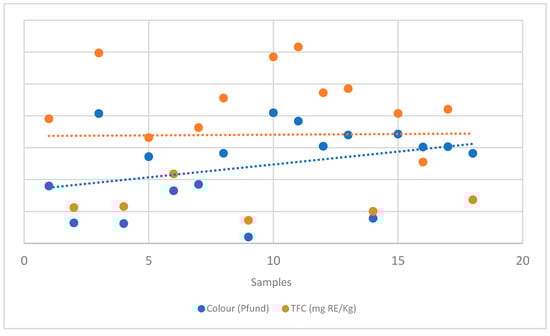 As shown in Table 2 and Figure S1, the colour of the various honey samples ranges from white to very dark amber. The lightest samples were Robinia pseudoacacia and blossom honey (H-2, 4, 9, and 14), the intermediates were Castanea sativa and multiflower honey (H-1, 6, and 7), while the others were all dark amber. Moreover, a positive correlation has also been found between TFC and colour (Pfund values in millimiters mm) in the tested honey samples, as shown in Figure 2.