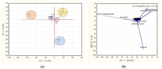 (a,b) Principal component analysis (PCA) of the volatile profiles of honey samples.