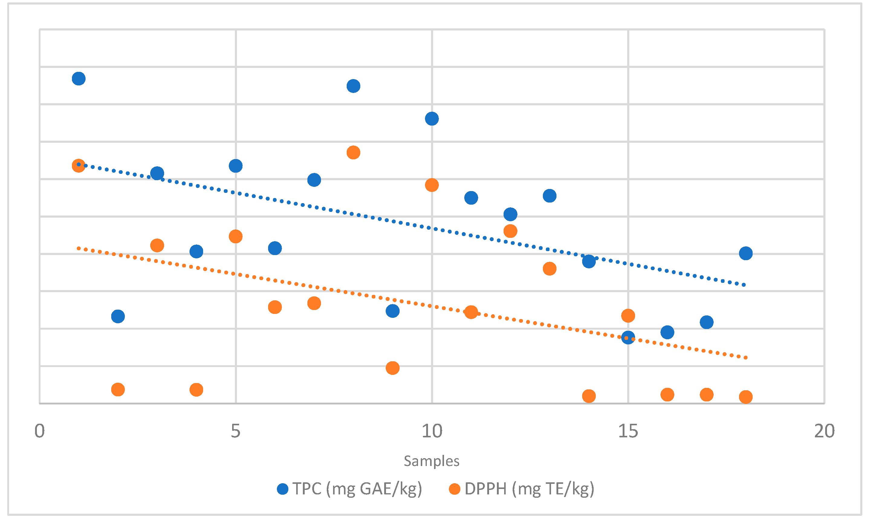 TPC (mg GAE/kg) | TFC (mg RE/kg) | DPPH (mg TE/kg) | |
