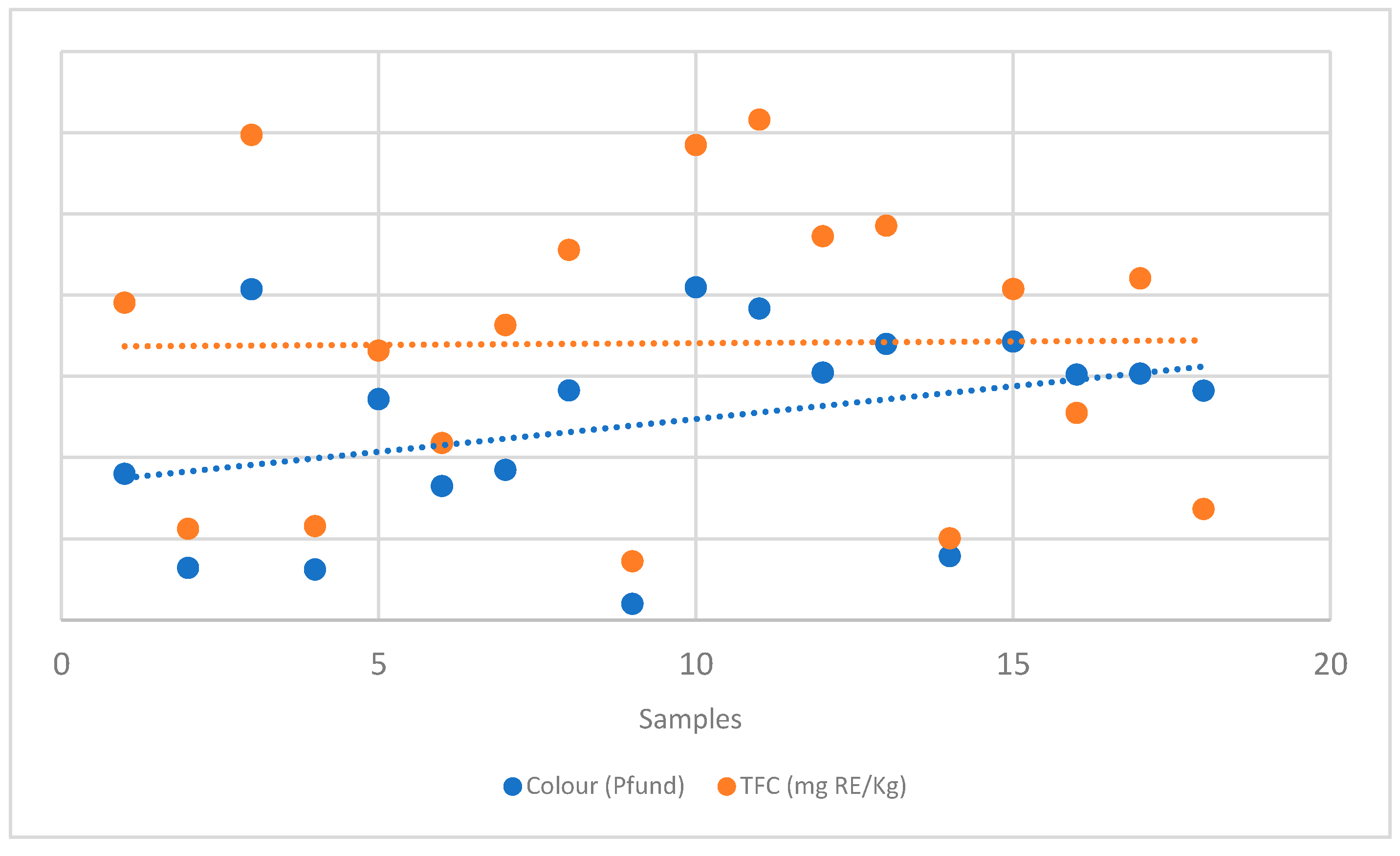 - Ciappini, M.; Gatti, M.; Di Vito, M. El Color Como Indicador Del Contenido de Flavonoides En Mieles. Rev. Cienc. Tecnol. 2013, 15, 59–63. [Google Scholar]