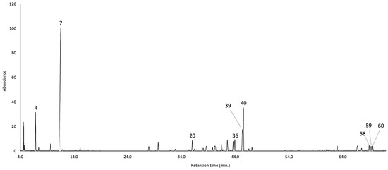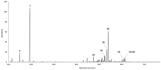 GC-MS profile of B. sinuata leaf EO on a 5%-phenyl–methylpolysiloxane stationary phase. The peak numbers refer to the major compounds (≥2.0% as average amount) in Table 1.