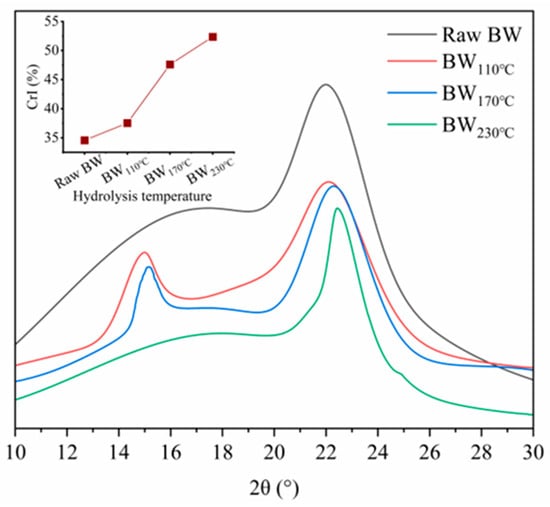 An XRD analysis was conducted to determine the crystallinity of raw BW and all samples and to calculate the corresponding crystallinity index (CrI) values (Figure 1). As the treatment temperature increased, the CrI values also increased, from around 35% for raw BW (control group) to 52% after the SST at 230 °C. The increase in CrI indicated that the high-temperature SST of BW led to the disruption of the crystal structure, with the effective removal or degradation of components such as lignin and xylan.