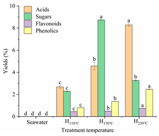 During the SST, the BW undergoes the degradation and dissolution of free components to produce organic compounds. These organic compounds typically include sugars, flavonoids, phenolics, and acidic components. Their contents in BW hydrolysates were measured and are shown in Figure 2. As can be seen from the assay results, the amount of these components in seawater is so small that it is neglected. The yields of phenolic and flavonoid components reached 0.8 ± 0.00% and 0.45 ± 0.01%, respectively, during the 110 °C treatment. The contents of these two substances increased significantly (p < 0.05) with increasing temperature, reaching maximum values of 2.47 ± 0.02% and 0.74 ± 0.01% yields, respectively, with the treatment at 230 °C. The content of sugars in the hydrolysates is 2.29 ± 0.04% with the treatment at 110 °C. There was a noticeable increase (p < 0.05) from the 110 °C to 170 °C treatment (Figure 2). The maximum yield of 8.74 ± 0.03% was obtained at 170 °C (Figure 2). However, at the highest temperature (230 °C) tested, the content of sugars showed a marked decrease compared with that produced at 170 °C (p < 0.05). The sugar yield reduced to 3.27 ± 0.05%. The content of acids in the hydrolysate also increased with higher-temperature treatments, rising from 2.68 ± 0.14% at 110 °C to the maximum yield of 8.29 ± 0.13% produced at 230 °C (Figure 2).