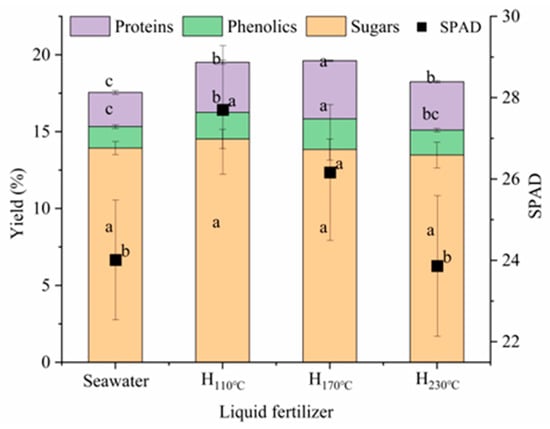 Content of proteins, phenolics, and sugars, and SPAD values of lettuce. Different letters indicate significant differences between the group (p < 0.05) based on Duncan’s multiple range test. Values represent means ± SE (n = 3) for individual sample. (H: hydrolysate).