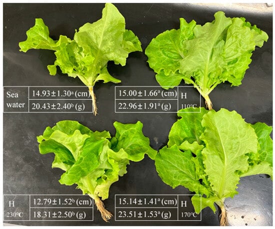 Figure 4 illustrates the height and weight of lettuce, with all crops harvested after 18 d of growth. The results show that lettuce irrigated with hydrolysate did not exhibit significant changes in height (p > 0.05). However, the yield (weight) of lettuce showed an increasing and then decreasing trend, with significantly higher weights in H110°C and H170°C groups (p < 0.05) compared with the control plant and H230°C, and a maximum value of 23.51 ± 1.53 g in H170°C, but no significant difference (p > 0.05) between H110°C and H170°C.