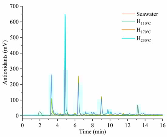 The total phenolics and flavonoids in the hydrolysate would originate from the dissolution of free components in the BW and the degradation of lignin at high temperatures []. This result indicated that an increase in temperature promoted the degradation of lignin in the BW and the dissolution of these substances. Previous studies have shown that plant biomass will degrade during hydrothermal treatment in seawater and dissolve into amino acids, phenolics, and sugars; the salts in seawater promote the formation of acids during the degradation process []. For antioxidant compounds, Figure 5 shows that, after hydrolysis at different temperatures, the area of the peaks for each substance varied independently, indicating that these components might undergo different extents of degradation or transformation at different temperatures.