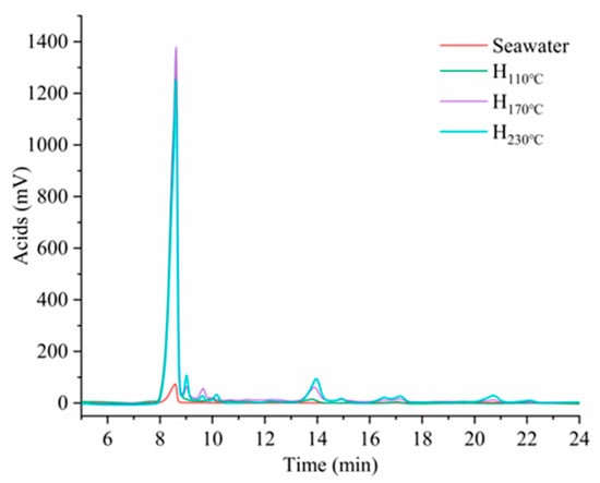 The quantities of certain elements detected in the hydrolysate are shown in Table 1. These elements are typically the main components of seawater and are also essential elements required for plant growth. Compared with seawater, the contents of all elements measured in the hydrolysate (except Ca2+) were higher and most of them increased with higher treatment temperatures. For instance, the total N content in the hydrolysate was 10 mg/L in seawater and increased with a higher treatment temperature to 200.03 mg/L at 230 °C. The content of K+ showed an increasing and then decreasing trend after the subcritical water treatment. The K+ content in seawater was 182.49 mg/L, and the maximum value of 597.43 mg/L was obtained at 110 °C, and then decreased to 589.11 mg/L with the increase in temperature. The Mg2+ content was detected to be the highest in the hydrolysate, reaching 749.95 mg/L after treatment at 230 °C from 612.05 mg/L in seawater, whereas the Ca2+ content decreased, from 199.96 mg/L in seawater to only 100.03 mg/L after treatment at 230 °C.