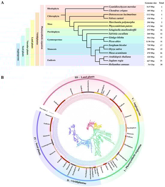 The genome datasets of 16 representative photosynthetic organisms were retrieved from public databases with the primary sources being EnsemblPlants (http://plants.ensembl.org/index.html, accessed on 15 September 2024) [34], Phytozome version 13.0 (https://phytozome-next.jgi.doe.gov/, accessed on 15 September 2024) [35], TAIR (https://www.arabidopsis.org/, accessed on 15 September 2024) [36], the Rice Genome Annotation Project (https://rice.uga.edu/, accessed on 15 September 2024) [37], Ginkgo DB (https://ginkgo.zju.edu.cn/, accessed on 15 September 2024) [38], Evorepro (https://evorepro.sbs.ntu.edu.sg/species/, accessed on 15 September 2024) [39], and Fernbase (https://fernbase.org/, accessed on 15 September 2024) [40].