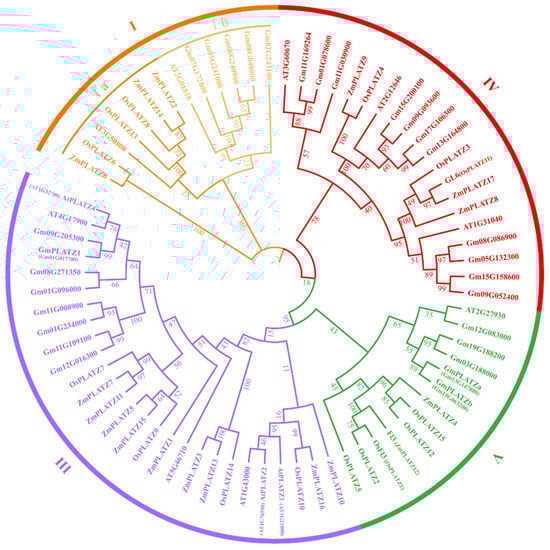 Phylogenetic tree of PLATZ proteins in Oryza sativa, Zea mays, Arabidopsis thaliana, and Glycine max. The prefixes Os, Zm, At, and Gm before the gene name represent Oryza sativa, Zea mays, Arabidopsis thaliana, and Glycine max, respectively. The numbers under the branches refer to the bootstrap values of the maximum likelihood phylogenetic tree. The four groups are represented by different colors.