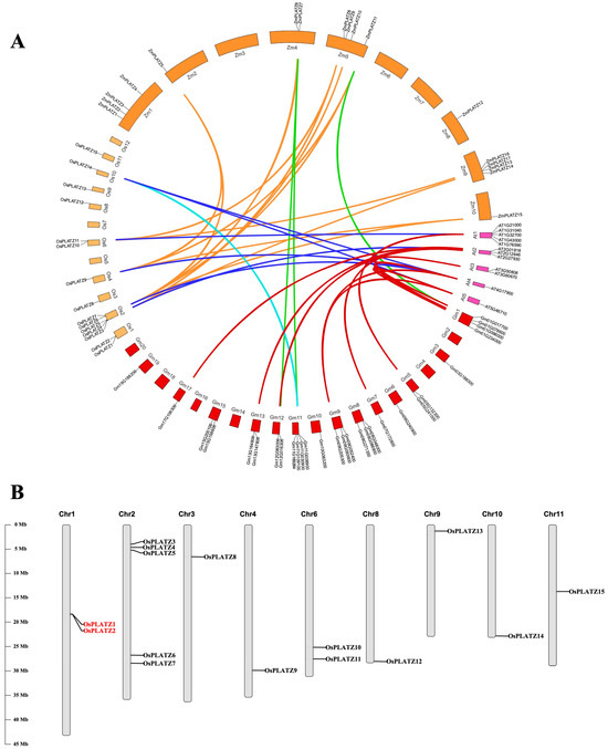 Collinearity analysis and mapping of OsPLATZs. (A) Collinear relationship analysis between orthologous PLATZ genes in rice, maize, Arabidopsis, and soybean. (B) Distribution and duplication of OsPLATZ genes in rice chromosomes. The tandem duplication event is marked in red. The chromosome numbers are shown at the top of each bar. The length of chromosomes was their relative extent. The scale on the left is in megabases (Mb).