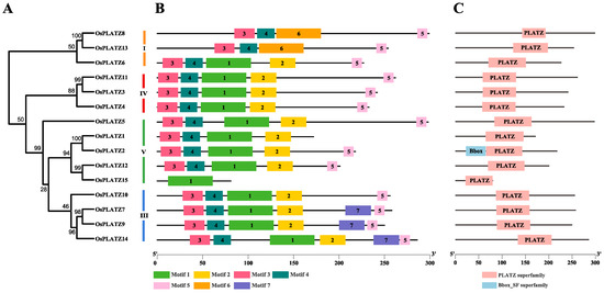 Due to the absence of the VP group, the phylogenetic tree of the OsPLATZs was divided into four clades as described above. The motif element analysis supports this classification (Figure 4A). Clades I and IV contained three OsPLATZs each, and four OsPLATZs were grouped into clade III. Clade V emerged as the largest, housing five OsPLATZs (Figure 4A). Seven motifs, designated motif-1 to motif-7, were identified through the MEME online tool (Table S1). The highly conserved distribution of the motifs within each group ensures accurate gene classification and the precise regulation of downstream genes. However, these motifs exhibited distinct divergence across four groups (Figure 4B). Motif-1, motif-2, and motif-6 overlap with the PLATZ domain (Table S1, Figure S4); furthermore, motif-3 and motif-4 overlap with the B-box domain, corresponding to the conserved cysteine and histidine residues in the N-terminal of PLATZ proteins (Table S1, Figure S4), which were found in all groups. Motif-5 corresponded to the termination region of PLATZs in all groups, suggesting the structural integrity of most PLATZs. The conserved motif-7 was only found in OsPLATZ7/9/14, which belong to clade III. All OsPLATZs contained PLATZ-conserved domains in the central region (Figure 4C and Figure S4), endowing them with the ability for zinc-dependent DNA binding.