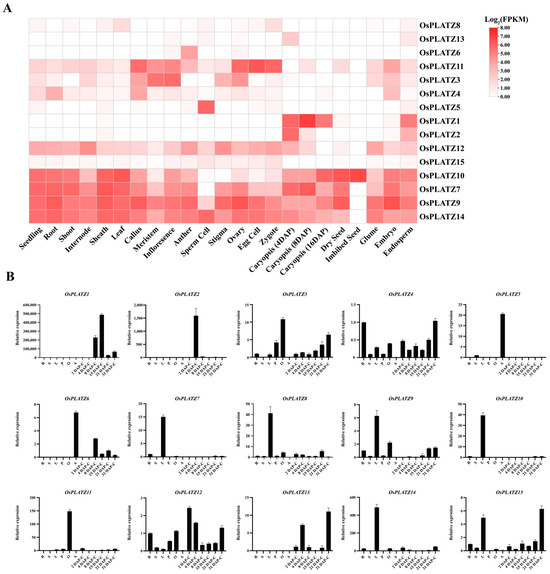 The spatiotemporal expression patterns of 15 OsPLATZs were characterized using transcriptome (Plant Public RNA-seq Database) data at different growth stages or in different tissues of rice [26]. In general, the expression patterns of OsPLATZ genes varied greatly in different tissues, indicating their potential involvement in multiple biological functions in rice (Figure 7A). Some OsPLATZ genes showed ubiquitous expression patterns, like OsPLATZ7, OsPLATZ9, OsPLATZ10, OsPLATZ12, and OsPLATZ14. In imbibed seeds, the expression level of OsPLATZ10 was relatively higher. Both OsPLATZ3 and OsPLATZ11 were highly expressed in callus, meristem, and inflorescence, with OsPLATZ11 also showing notable expression in the ovary, egg cell, and zygote. OsPLATZ4 had an overall low expression level, with relatively higher expression in the root, callus, and embryo. The expression levels of OsPLATZ8, OsPLATZ13, and OsPLATZ15 in all tissues were generally relatively low. Notably, some members showed tissue-specific expression patterns. OsPLATZ5 was specifically expressed in sperm cells, and OsPLATZ6 was specifically expressed in anthers. Both OsPLATZ1 and OsPLATZ2 were specifically expressed in the endosperm, exhibiting developmental specificity. OsPLATZ1 began to express at 4 DAP, peaked at 8 DAP, and decreased after 16 DAP. Interestingly, OsPLATZ2 was highly expressed at 4 DAP and then rapidly declined (Figure 7A). The relative quantification of OsPLATZs by qRT-PCR was similar to the RNA-seq expression profile (Figure 7B). However, due to sampling differences and batch effects in the public data, the quantitative results were inconsistent with the expression profile of transcriptome sequencing and require further analysis.