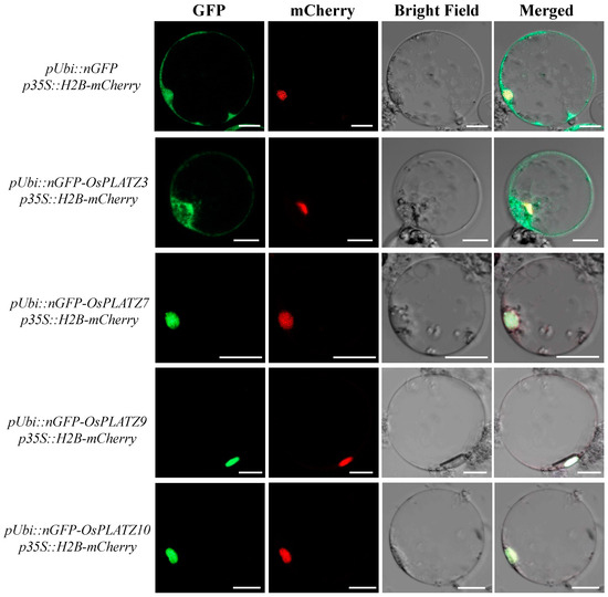 Most PLATZ proteins in rice are predicted to be located in the nucleus (Table S3). To better understand the characteristics of these proteins, four OsPLATZs, OsPLATZ3/7/9/10, were randomly selected for subcellular localization analyses. As illustrated in Figure 8, the complete coding sequences of OsPLATZ3/7/9/10 were cloned into the pRTV-nGFP vector under the control of the Ubiqutin promoter to construct vectors pUbi::nGFP-OsPLATZ3/7/9/10. Rice protoplasts were isolated and transiently co-transformed by pUbi::nGFP-OsPLATZ3/7/9/10 plasmids with the p35S::H2B-mCherry plasmid, which expresses a nucleus-localized protein, respectively. The signal of the control vector pUbi::nGFP was detected in the nucleus and cell membrane, and consistent expression patterns were observed in OsPLATZ3 (Figure 8). The GFP signals of OsPLATZ7/9/10 were observed in the nuclei and colocalized with the red fluorescence H2B-mCherry fusion protein. These results suggested that OsPLATZ proteins are located in the nuclei to participate in various biological processes.