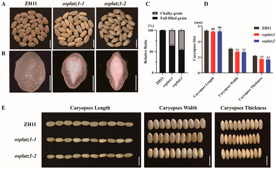 Phenotypic analyses of OsPLATZ1 knockout mutants. (A) Mature caryopses of ZH11, osplatz1-1, and osplatz1-2. Bars = 5 mm. (B) Surface views of cracked mature caryopses from ZH11, osplatz1-1, and osplatz1-2. Bars = 1 mm. (C) Chalky caryopses percentage of ZH11, osplatz1-1, and osplatz1-2 were quantified. n = 30, ** p < 0.01. (D) Statistical analysis of caryopses length, width, and thickness of ZH11, osplatz1-1, and osplatz1-2. n = 30, ** p < 0.01. ns, not significant. (E) Comparisons of 10-caryopses length, width, and thickness of ZH11, osplatz1-1, and osplatz1-2. Bars = 5 mm.