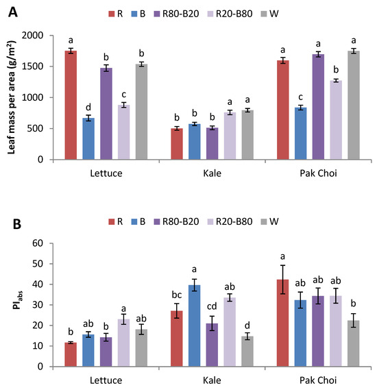 Lettuce and pak choi followed a very similar trend regarding their LMA performance. Specifically, the treatments with the greatest red-light emissions (R, R80-B20, and W) imposed the accumulation of the highest yield in these crops. Pak choi was probably expected to perform similarly to kale since both species are cruciferous (Brassicaceae) while lettuce belongs to the Asteraceae family. A similarity among all tested species was the decelerated growth rate under the monochromatic B light. It is known that monochromatic blue light suppresses the leaf growth, limiting the capacity to absorb light and drive photosynthesis. However, a combination of red-blue wavelengths is usually beneficial for plant growth, leading to greater yields. For example, a study with red pak choi demonstrated that a 3:1 red/blue combination led to greater shoot fresh weight compared to other treatments, including white and white supplemented with red [11]. In addition, red light has consistently been reported to enhance the growth of lettuce and other leafy and non-leafy vegetables as the most effective light spectrum for plant growth and photosynthesis [12]. A group of proteins called phytochromes are responsible for absorbing red light, which in turn induces plant growth and development, including the photosynthetic mechanism and the starch accumulation of [13]. For example, two lettuce cultivars showed increasing shoot fresh weight when grown under an increasing proportion of red light, while blue light induced the opposite result [14]. On the other hand, kale grown under different LED spectra (white or different red/blue ratios, as well as various radiation durations) did not show significant shoot fresh mass differences [15]. In another study, three kale cultivars did not exhibit significant effects in their fresh biomass when grown under three LEDs (different blue peak) or a cool-white fluorescent fixture [16].