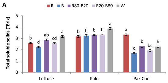Thet total soluble solids of lettuce were significantly greater in W compared to R, B, and R20-B80, where R was the second-best treatment while B showed the lowest values. In kale, the trend was similar to lettuce, but the values were significantly greater in W compared to all other treatments. Pak choi developed more total soluble solids under R compared to the rest of the treatments, R80-B20 and W followed, while B showed the lowest values (96% lower than R) (Figure 2A).