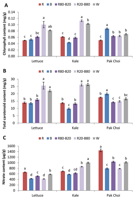 (A) Total chlorophyll content, (B) total carotenoid content, and (C) nitrate content of lettuce, kale, and pak choi baby leaves grown in a plant factory under five light treatments. Within each species, bars (±SE) followed by different letters are significantly different (p ≤ 0.05).