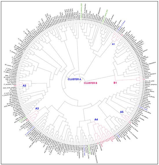 Pairwise relationship analysis (LRM) [41] was performed to assess allelic similarity and identify potential synonymies using GenAlEx v.6.502 software [42]. The paternity analysis was conducted using Cervus v.3.0 software to identify potential parentage among the 16 selected samples. Finally, phylogenetic relationships among the olive samples and database accessions were analyzed through the construction of a Neighbor-Joining tree [43] with Darwin5 v.6.0.010 software (http://darwin.cirad.fr, accessed on 4 October, 2024). The robustness of the tree branches was evaluated with 1000 bootstrap replicates [44].
