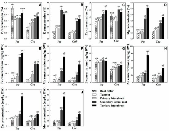 Nutrient distribution in different root parts of trifoliate orange (Ptr) and red tangerine (Cre) seedlings. (A) P concentration; (B) K concentration; (C) Ca concentration; (D) Mg concentration; (E) Fe concentration; (F) Mn concentration; (G) B concentration; (H) Zn concentration; (I) Cu concentration; (J) Mo concentration. Data are presented as the mean ± SE of six biological replicates. Different lowercase and uppercase letters above the bars indicate significant differences (p < 0.05) between the different root parts and the citrus rootstock species, respectively.