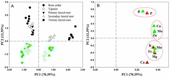Principal component analysis (A) and loading scatter plot (B) of 10 elements in different root parts of trifoliate orange and red tangerine seedlings. Green symbols in (A) represent red tangerine, and black symbols represent trifoliate orange; green symbols in (B) represent micronutrients, and red symbols represent macronutrients. The red circle in subfigure (B) indicated that the correlation between nutrient elements was significant.