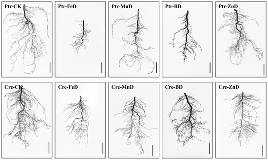 Scanned images of the root morphology of two types of citrus rootstocks under different micronutrient deficiency conditions. Ptr: trifoliate orange, Cre: red tangerine, CK: control, FeD: iron deficiency, MnD: manganese deficiency, BD: boron deficiency, and ZnD: zinc deficiency. Bar = 2 cm.