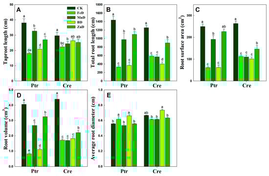 Root system architecture response to micronutrient deficiency stress in trifoliate orange (Ptr) and red tangerine (Cre) seedlings. (A) Taproot length; (B) Total root length; (C) Root surface area; (D) Root volume; (E) Average root diameter. Data are presented as the mean ± SE of six biological replicates. Different lowercase letters above the bars indicate significant differences (p < 0.05) between the different root parts and the citrus rootstock species, respectively. CK: control, FeD: iron deficiency, MnD: manganese deficiency, BD: boron deficiency, and ZnD: zinc deficiency.
