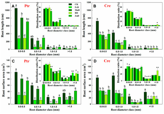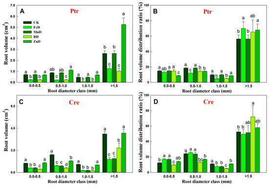 Compared with the CK treatment, the root length of Ptr was significantly decreased under FeD and BD conditions at all root diameter classes, but for the MnD and ZnD treatments, the root length only decreased significantly when the root diameter was 0.0–0.5 mm. The distribution ratio of Ptr root length only decreased significantly at a root diameter of 0.0–0.5 mm and increased significantly at a root diameter of 0.5–1.0 mm under the ZnD treatment (Figure 5A). Different from Ptr, the root length of Cre was significantly decreased compared with CK under all micronutrient deficiency conditions and in all root diameter classes. The distribution ratio of Cre root length was significantly increased at a root diameter of 0.0–0.5 mm and significantly decreased at a root diameter of 0.5–0.1 mm under the FeD treatment. In contrast, under the BD treatment, the distribution ratio of Cre root length was significantly decreased at a root diameter of 0.5–0.1 mm and significantly increased at a root diameter of >1.5 mm (Figure 5B). The root surface area in Ptr and Cre was significantly inhibited by FeD, MnD, and BD stress in all root diameter classes, but the Ptr root surface area was not significantly reduced under ZnD conditions when the root diameter was >0.5 mm. The distribution ratio of the Ptr root surface area was significantly decreased at a root diameter of 0.0–0.5 mm but increased at root diameters of 0.5–1.0 mm and >1.5 mm under the ZnD treatment. For the FeD and BD treatments, the distribution ratio of the Ptr root surface area decreased significantly at root diameters of 0.5–1.0 and 1.0–1.5 mm but increased at a root diameter of >1.5 mm. Different from Ptr, the distribution ratio of the Cre root surface area was significantly increased at a root diameter of 0.0–0.5 mm and significantly decreased at a root diameter of 1.0–1.5 mm under the FeD and MnD treatments. For BD treatments, the distribution ratio of the Cre root surface area was decreased significantly at root diameters of 0.5–1.0 and 1.0–1.5 mm but increased at a root diameter of >1.5 mm (Figure 5C,D). The effects of micronutrient deficiency on the distribution and ratio of root volume in Ptr and Cre seedlings were also analyzed in this work (Figure 6). Compared with the CK treatment, the root volume of Ptr was decreased significantly under FeD and BD conditions at all root diameter classes, but there was no significant difference for the MnD and ZnD treatments. The root volume only increased significantly when the root diameter was >1.5 mm under the ZnD treatment. For Cre, the root volumes decreased significantly under FeD, MnD, and BD conditions at all root diameter classes, but the root volume only decreased significantly when the root diameter was 0.5–1.0 mm under the ZnD treatment. The distribution ratio of Ptr root volume decreased significantly at a root diameter of 0.5–1.5 mm and increased significantly at a root diameter of >1.5 mm under the FeD and BD treatment. But, no significant change was found in Ptr root volume under MnD treatment. For Cre, the distribution ratio of root volume decreased significantly at a root diameter of 0.0–1.5 mm and increased significantly at a root diameter of >1.5 mm under the BD treatment. The distribution ratios of root volume were significantly increased at a root diameter of 0.0–1.0 mm but decreased at root diameters of 1.0–1.5 mm under the FeD and MnD treatment and only decreased at root diameters of 0.5–1.5 mm for ZnD treatment.