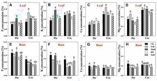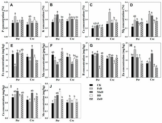 The concentrations of mineral macronutrients (P, K, Ca, and Mg) in the leaves and roots of Ptr and Cre seedlings are presented in Figure 7. MnD significantly increased the P concentrations in the leaves of Ptr and Cre, and a similar tendency was found in the leaves of Cre under FeD conditions. In contrast, the root P concentration was significantly reduced in both Ptr and Cre, except for in MnD- and ZnD-treated Ptr. For K, the MnD treatment significantly enhanced the leaf K concentration in Ptr, while the BD treatment significantly decreased the leaf K concentration in Cre. All treatments reduced the root K concentrations, except for MnD in Ptr and ZnD in Cre. The leaf Ca concentration was significantly elevated in Ptr under BD and in Cre under FeD, whereas no significant changes were detected in root Ca concentrations, except for in FeD-, BD-, and ZnD-treated Ptr seedlings. The Mg concentration in the leaves of Ptr and Cre was reduced under BD conditions, whereas it was increased by the FeD treatment. The root Mg concentration was also reduced under micronutrient deficiency conditions, except for in FeD- and MnD-treated Cre seedlings.