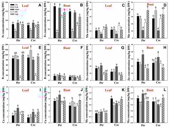 Effects of micronutrient deficiency on the micronutrient concentrations (mg/kg DW) in the leaves and roots of trifoliate orange and red tangerine seedlings. Fe concentration in leaf (A) and root (B); Mn concentration in leaf (C) and root (D); B concentration in leaf (E) and root (F); Zn concentration in leaf (G) and root (H); Cu concentration in leaf (I) and root (J); Mo concentration in leaf (K) and root (L). Trifoliate orange (Ptr) and red tangerine (Cre) seedlings were grown under different micronutrient deficiency conditions for 12 weeks. Data are presented as means ± SE of nine replicates (n = 9, one plant for each replicate). Different lowercase letters above the bars indicate significant differences (p < 0.05) between different growth conditions. CK: control, FeD: iron deficiency, MnD: manganese deficiency, BD: boron deficiency, and ZnD: zinc deficiency.