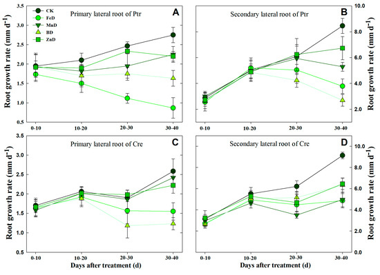 Based on the above results, dynamic analyses of LR development were conducted in Ptr and Cre under micronutrient deficiency conditions by determining the different-order LR growth rates (Figure 10). Under normal (CK) conditions, the growth rates of first and second LRs in both rootstock species displayed changes with treatment time. Under FeD conditions, the Ptr root elongation rate decreased significantly in first LRs, but it increased at first and then decreased in second LRs. For Cre, the rate remained unchanged after 10 days of FeD treatment in both LRs. Under MnD and ZnD conditions, the root growth rate did not change significantly in the first LR of Cre, but the root growth rate dropped significantly at the end of the treatments in the second LR of Cre and in both the first and second LRs of Ptr. For BD-treated Ptr, the root growth rate remained unchanged during the entire treatment period in the first LR, whereas the root growth rate first increased and then declined in the second LR. However, for BD-treated Cre, the root growth rate showed a downward trend in the first LR and a slowly increasing trend in the second LR during the treatment time (Figure 10).